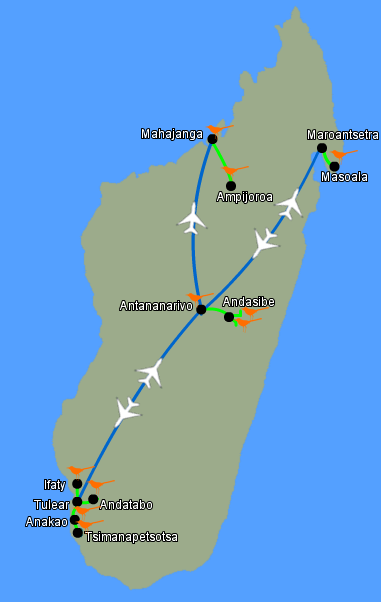 | Top targets | Madagascan Sandgrouse, Red-tailed Tropicbird, Long-tailed Ground Roller, Rufous-headed Ground Roller, Pitta-like Ground Roller, Short-legged Ground Roller, Subdesert Mesite, Brown Mesite, White-breasted Mesite, Verreaux’s Coua, Running Coua, Crested Coua, Blue Coua, Red-breasted Coua, Schlegel’s & Velvet Asity, Helmet Vanga, Bernier’s Vanga, Red-shouldered Vanga, Rufous Vanga, Pollen’s Vanga, Van Dam’s Vanga, Nuthatch Vanga, White-headed Vanga, Sickle-billed Vanga, Litoral Rock Thrush, Madagascan Ibis, Madagascan Fish Eagle, Frances’s Sparrowhawk, Malagasy Harrier, Madagascar Wood Rail. |